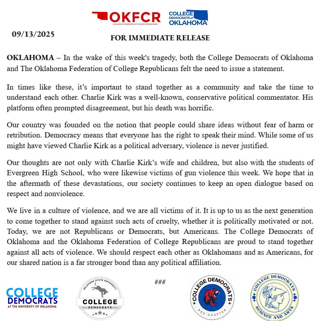 The College Democrats of Oklahoma and the Oklahoma Federation of College Republicans issued a joint statement Saturday stating it is their duty to make it clear that acts of violence will not be tolerated, regardless of political affliation.