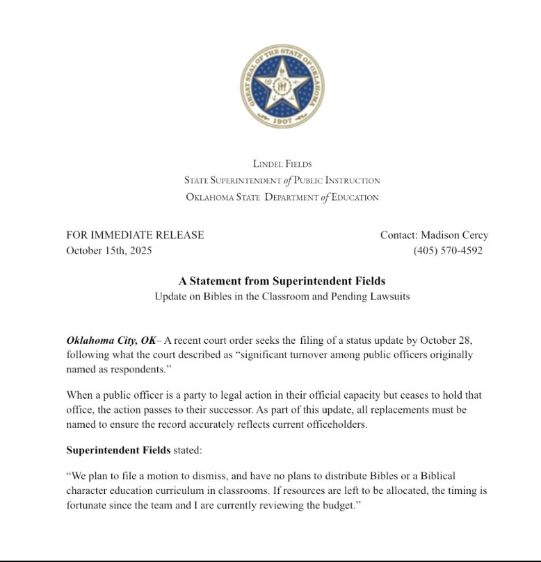 In a statement issued Wednesday, Fields says the State Department of Education will file a motion to dismiss a lawsuit about Walters’ move to integrate Bibles and biblical education into school curriculum.