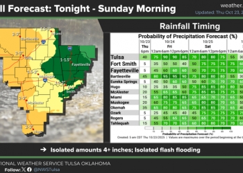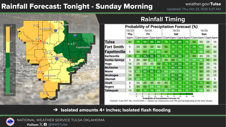 The National Weather Service in Tulsa says low rain and storm chances develop late Thursday afternoon or early Thursday evening, becoming likely during the overnight hours through Saturday and into Sunday morning.