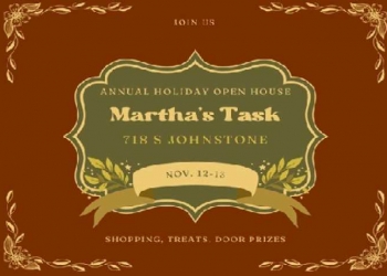 Martha’s Task will celebrate the holiday season with its annual Holiday Open House on Nov. 12 and 13 at its downtown Bartlesville location, 718 S. Johnstone Ave. The event runs from 9 a.m. to 5 p.m. Wednesday and 9 a.m. to 6 p.m. Thursday, featuring handmade gifts, holiday treats and an opportunity to visit with friends and community members.