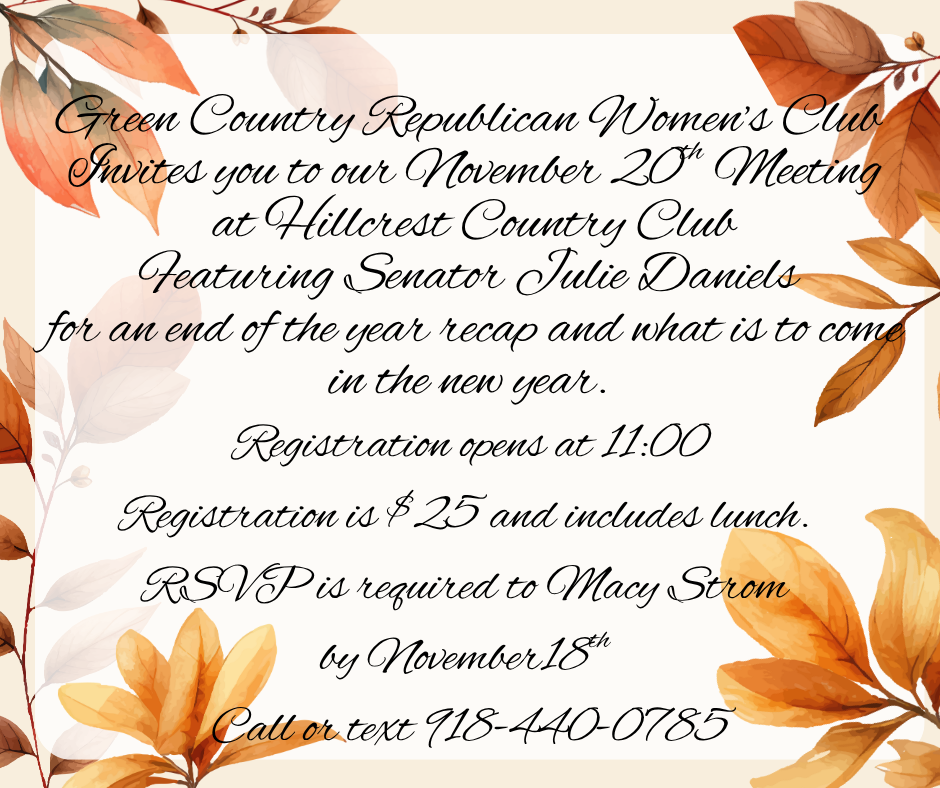 The Green Country Republican Women’s Club is hosting a meeting with State Sen. Julie Daniels on Thursday, Nov. 20 at Hillcrest Country Club in Bartlesville.