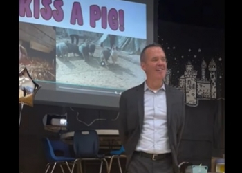 As a joint effort between Bartlesville Public Schools and Young Scholars of Bartlesville, local retiring superintendent Chuck McCauley kissed a pig at a Monday assembly at Richard Kane Elementary School. Students filed in with colored pig signs to cheer on the superintendent. The gym erupted into laughter and squeals as show pig Steve entered the gymnasium. The broadcast class from Bartlesville High School was there to catch it all on film.