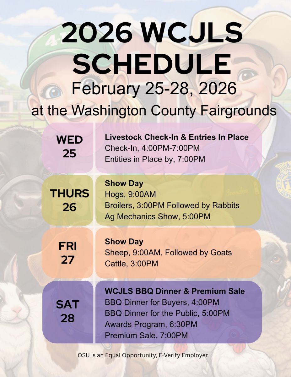 We'll see you at the 2026 Washington County Junior Livestock Show February 26-28 at the county fairgrounds in Dewey.