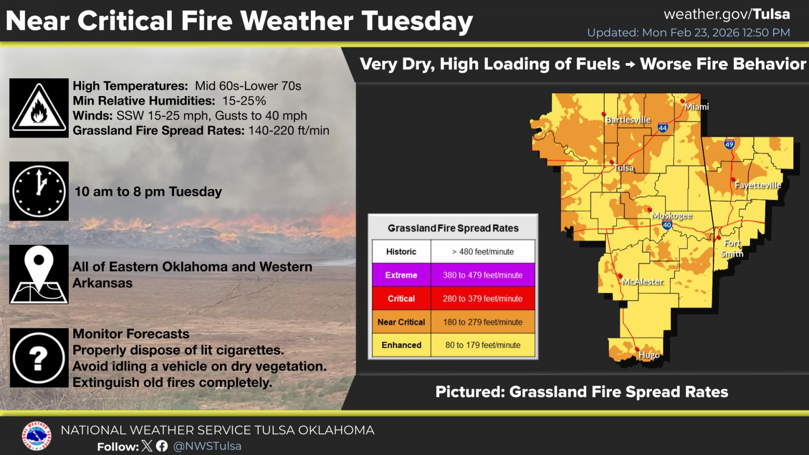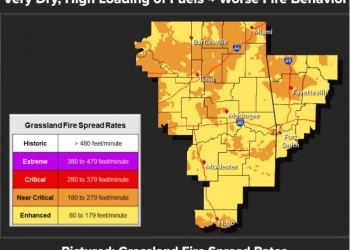 The National Weather Service says near critical fire spread rates will develop across parts of eastern Oklahoma, and with very dry and high loading of fuels, worse fire behavior may occur.