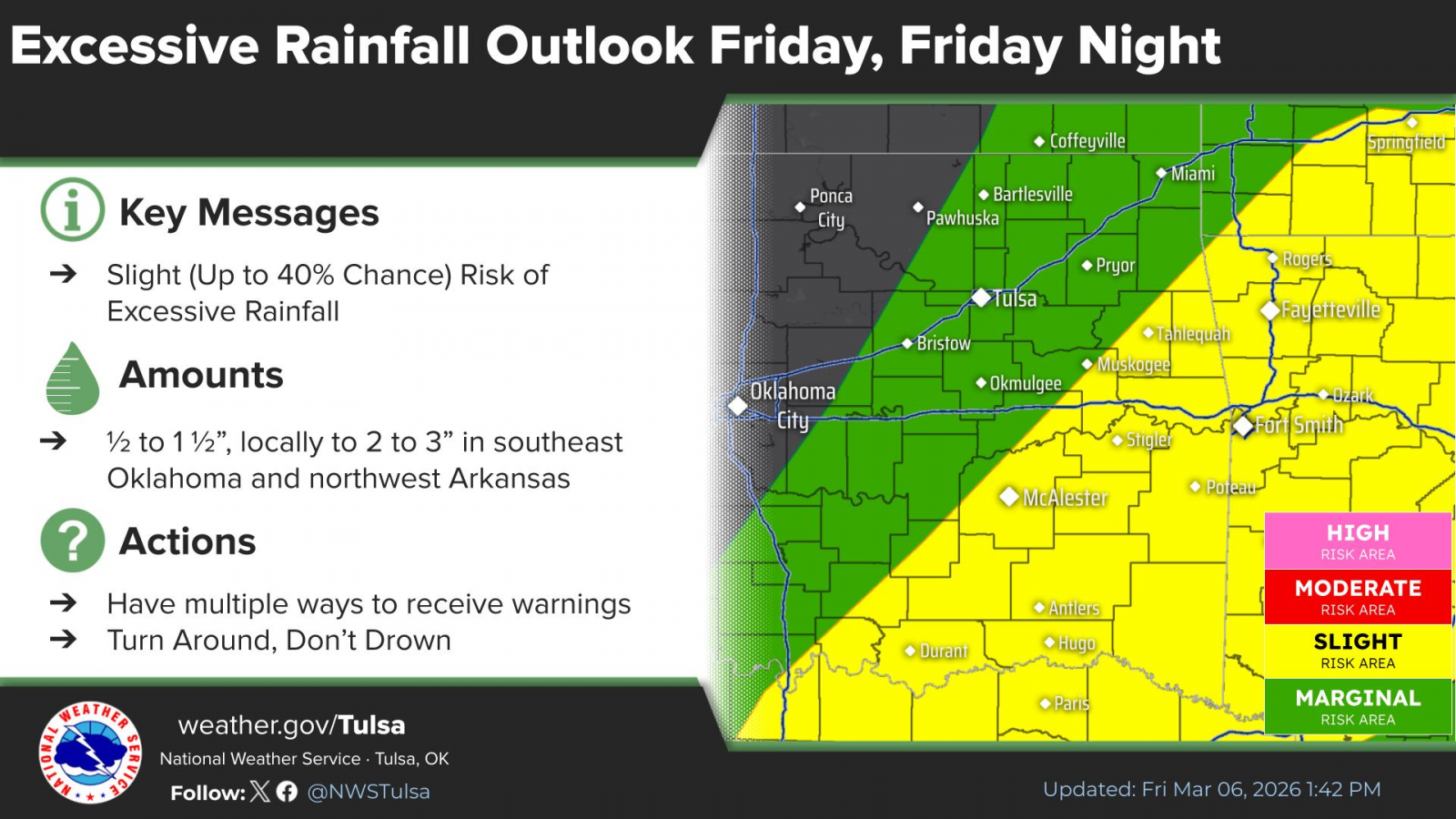 Areas of heavy rain are likely. Storms will initially focus across southeast Oklahoma, spreading north and east with time. Storm activity will diminish overnight behind a cold front.